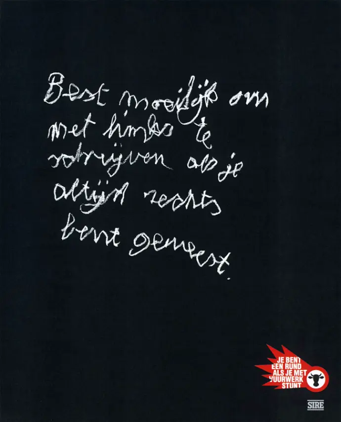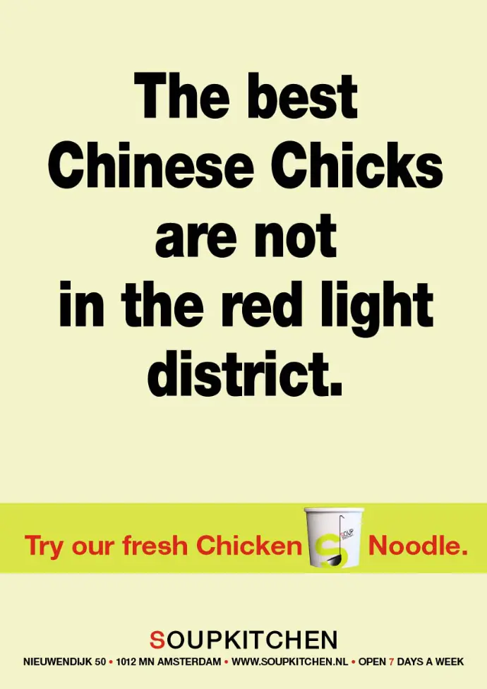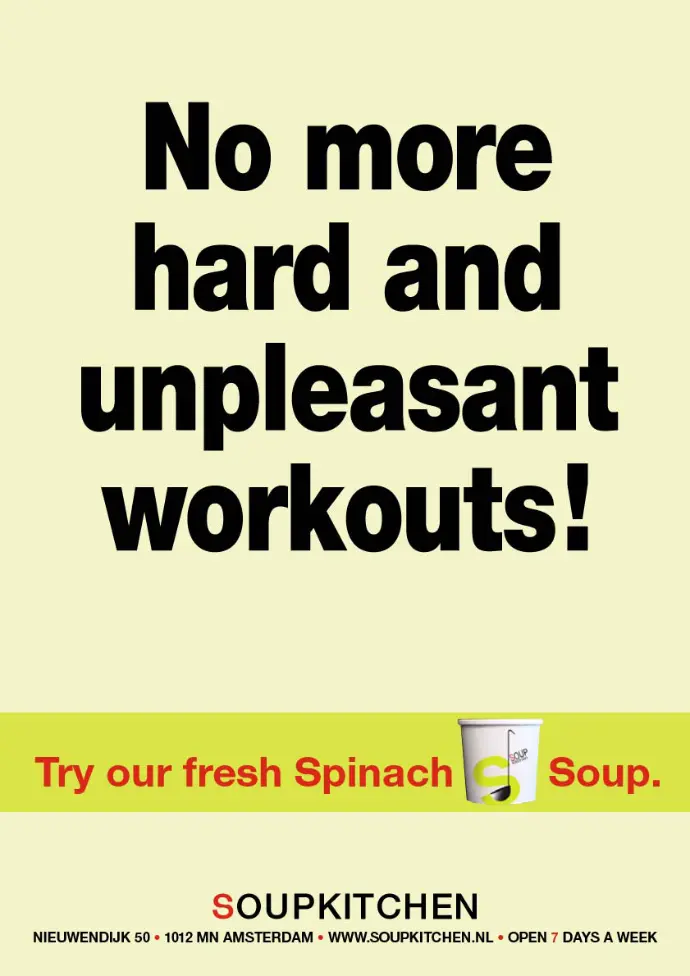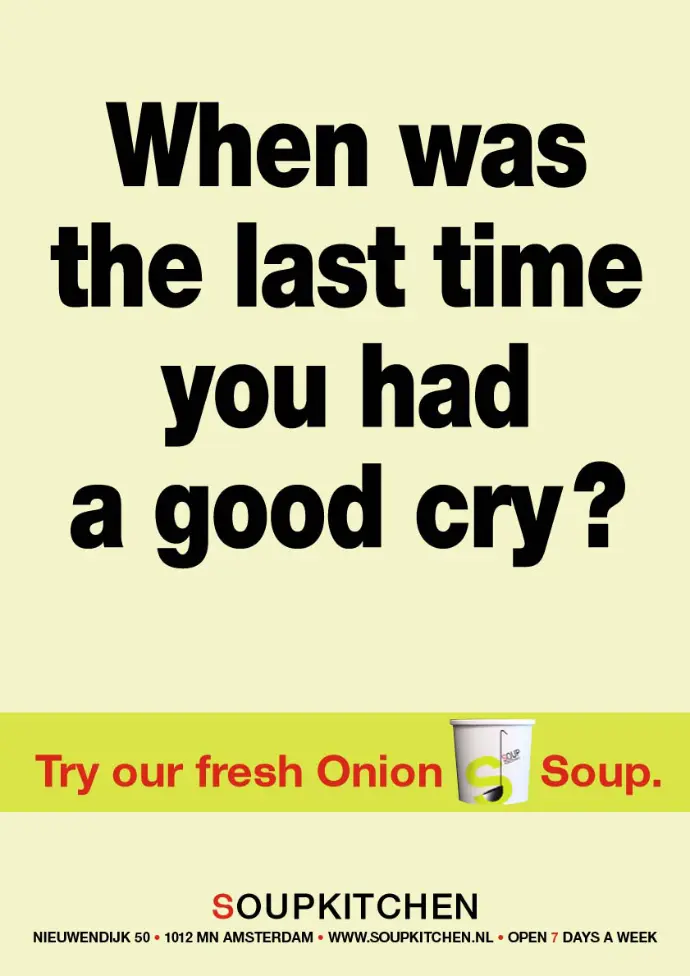 Por último, nos gustaría compartir algunas creaciones que, en nuestra opinión, merecen ser mostradas. Ya sea porque provocan una sonrisa, sorprenden o son lo suficientemente impactantes como para tener un lugar aquí. Ya se trate de un cartel para un restaurante de sopas o un anuncio para el Hospital Groene Hart, toda nuestra comunicación es siempre clara y directa.